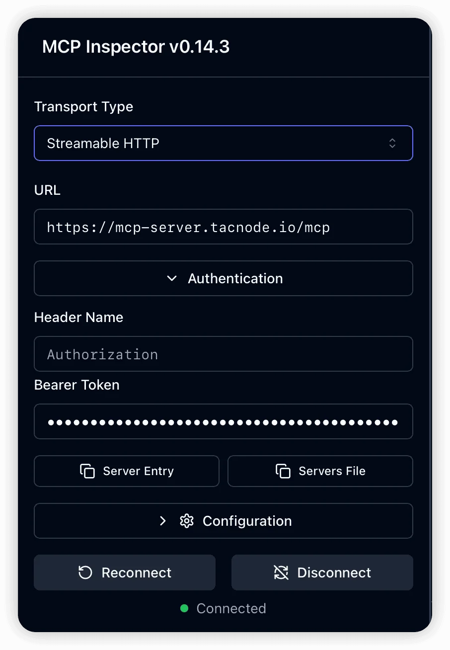 - Authentication: Bearer Token (your generated MCP token)