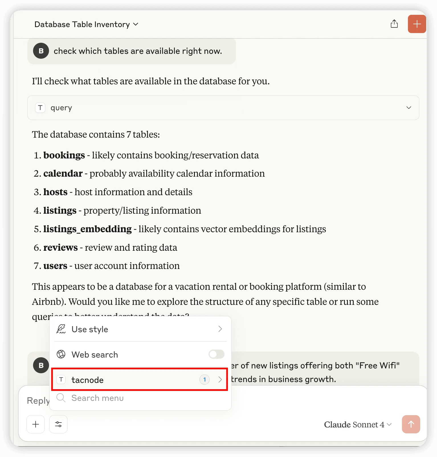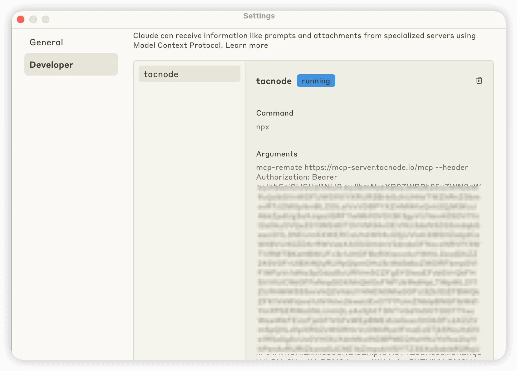 After configuration, the Tacnode MCP Server appears in Claude → Settings → Developers, and the tacnode tool becomes available in your chat sessions.