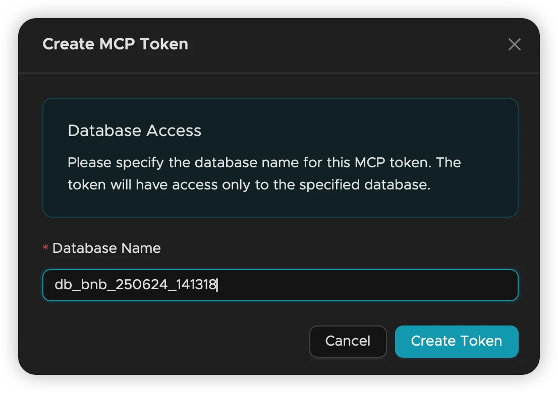 - Click Create Token and specify the target Database name
