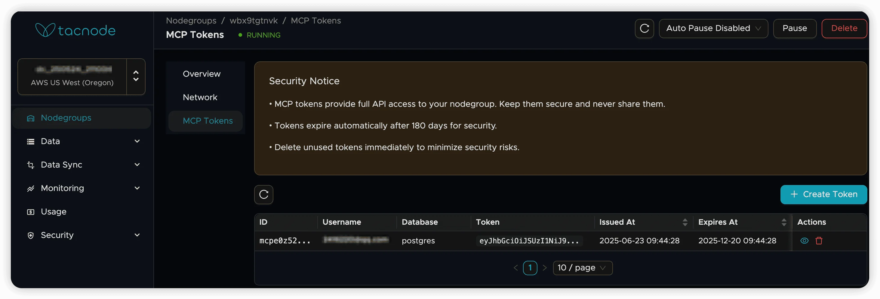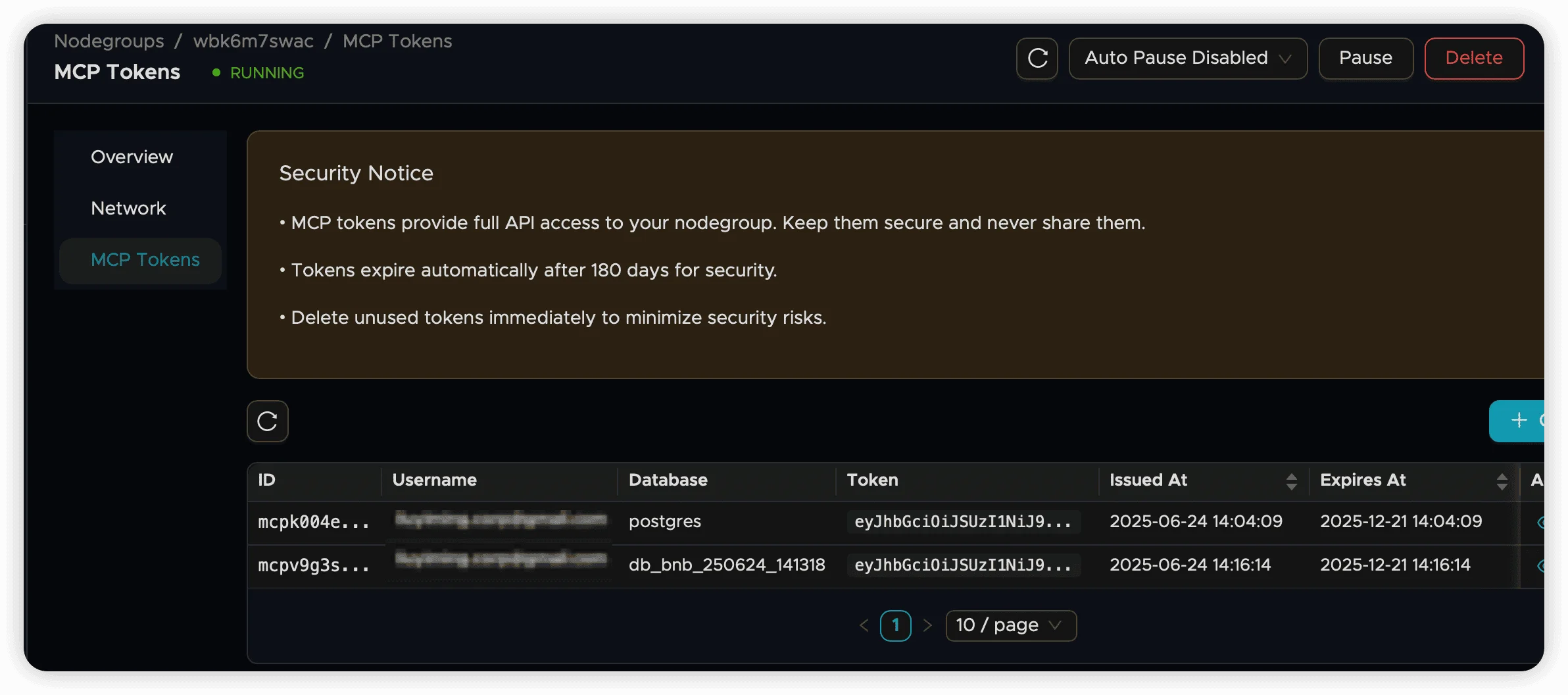 Once your infrastructure is ready, MCP token management becomes available in your Nodegroup details page. Each generated token is automatically bound to the corresponding compute and storage resources.