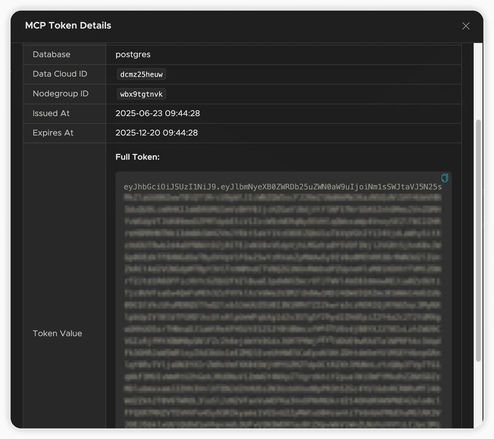 MCP tokens provide secure access control by linking SQL execution permissions to specific computational (Nodegroup) and storage (Database) resources. Each token includes account-level permissions for the selected database and has a 180-day validity period.
