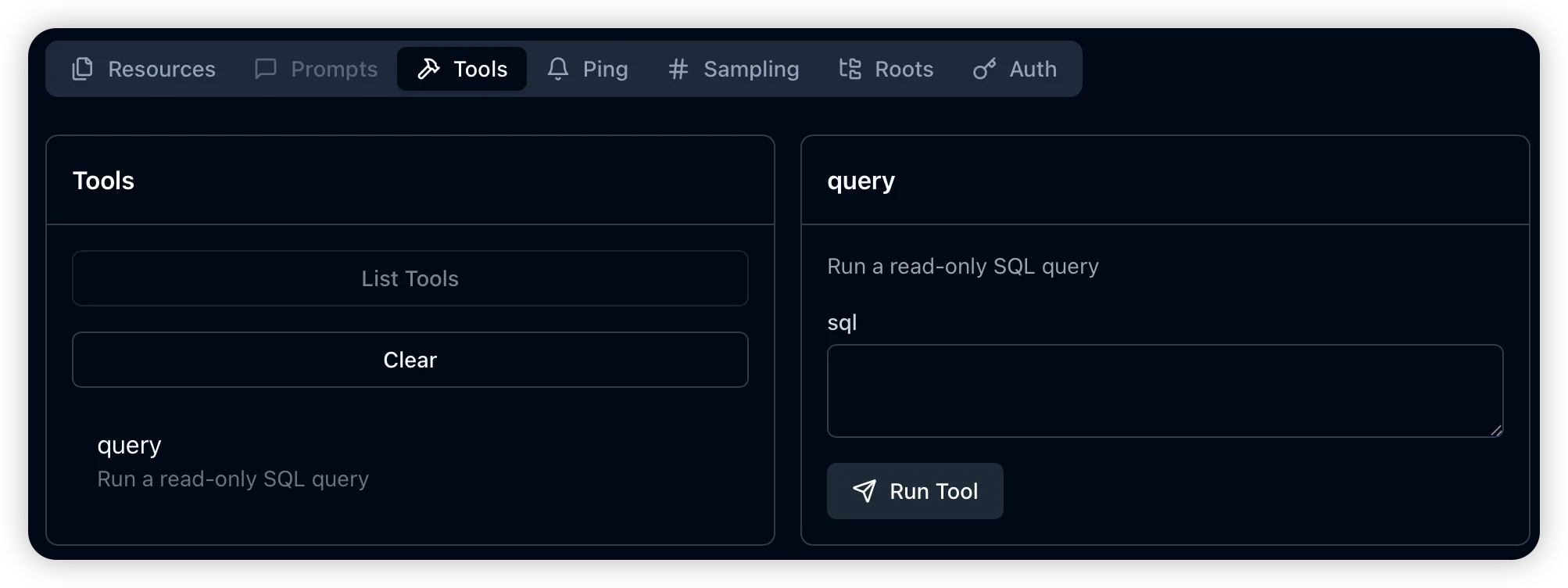 - Tools List/Call: Execute read-only SQL queries against your database