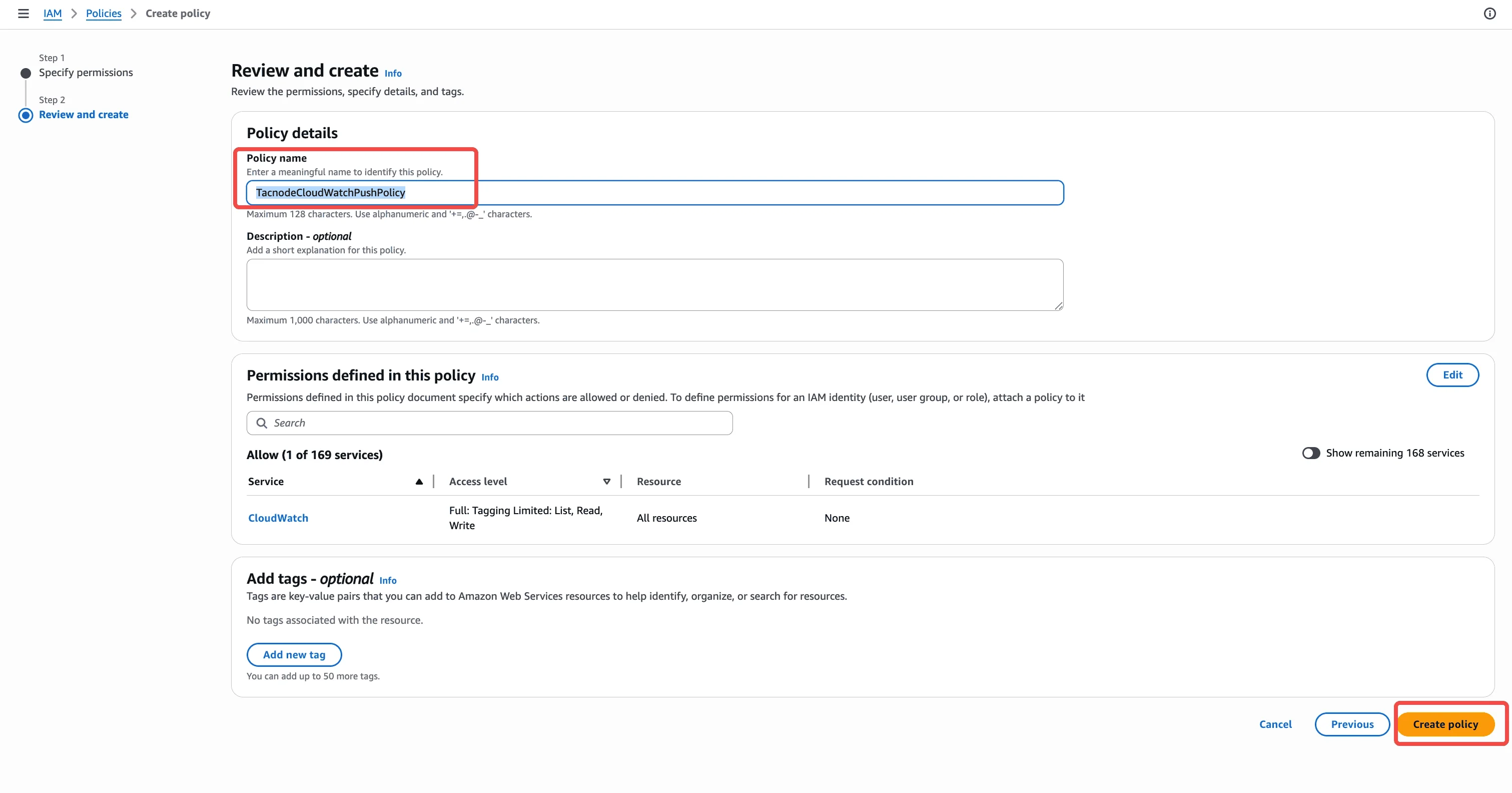 TacnodeCloudWatchPushPolicy - Add description: “Allows Tacnode to push metrics to CloudWatch”