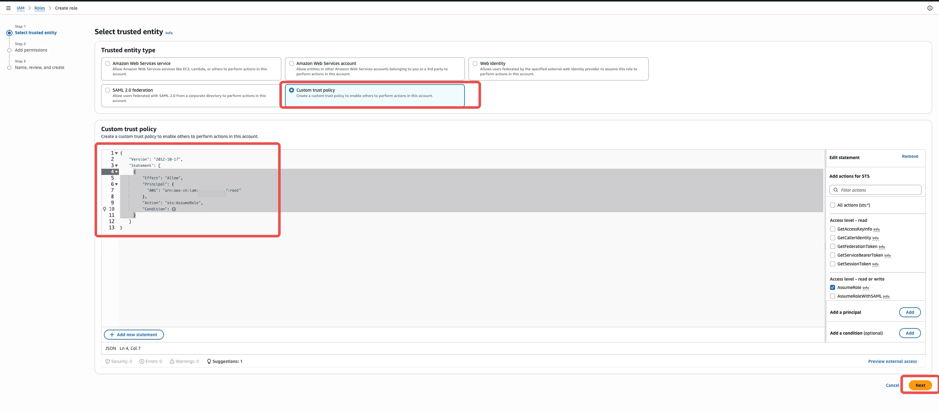 { "Version": "2012-10-17", "Statement": [ { "Effect": "Allow", "Principal": { "AWS": "arn:aws:iam::{ACCOUNT_ID}:root" }, "Action": "sts:AssumeRole", "Condition": {} } ] }