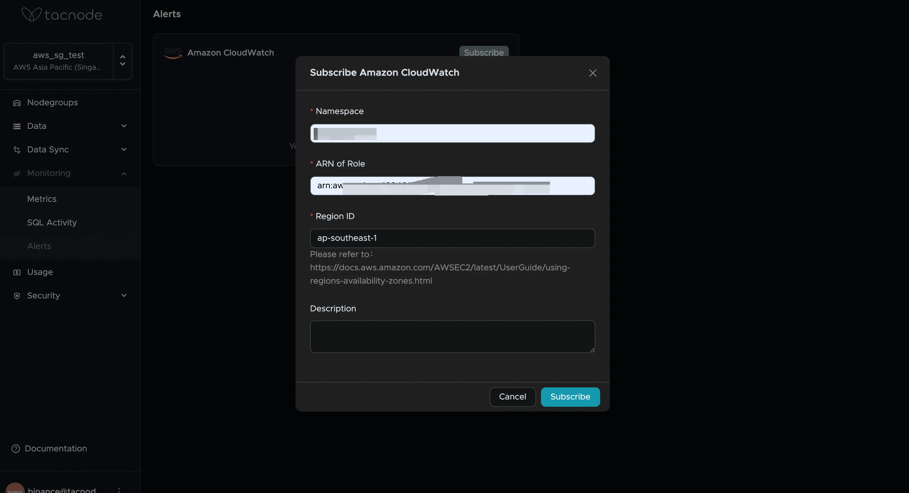 Learn how to integrate Tacnode with AWS CloudWatch for centralized monitoring, alerting, and observability across your AWS infrastructure.