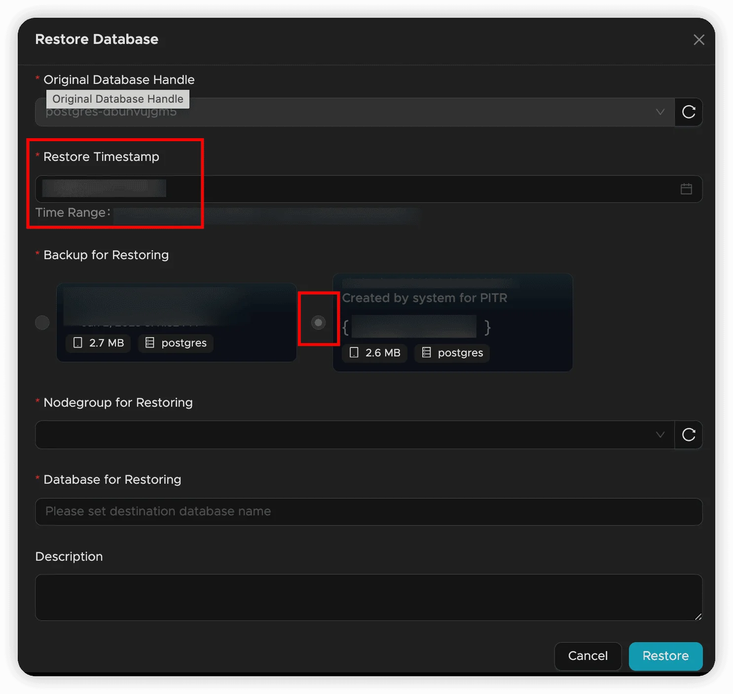 - Recovery Time: Select the exact timestamp for restoration