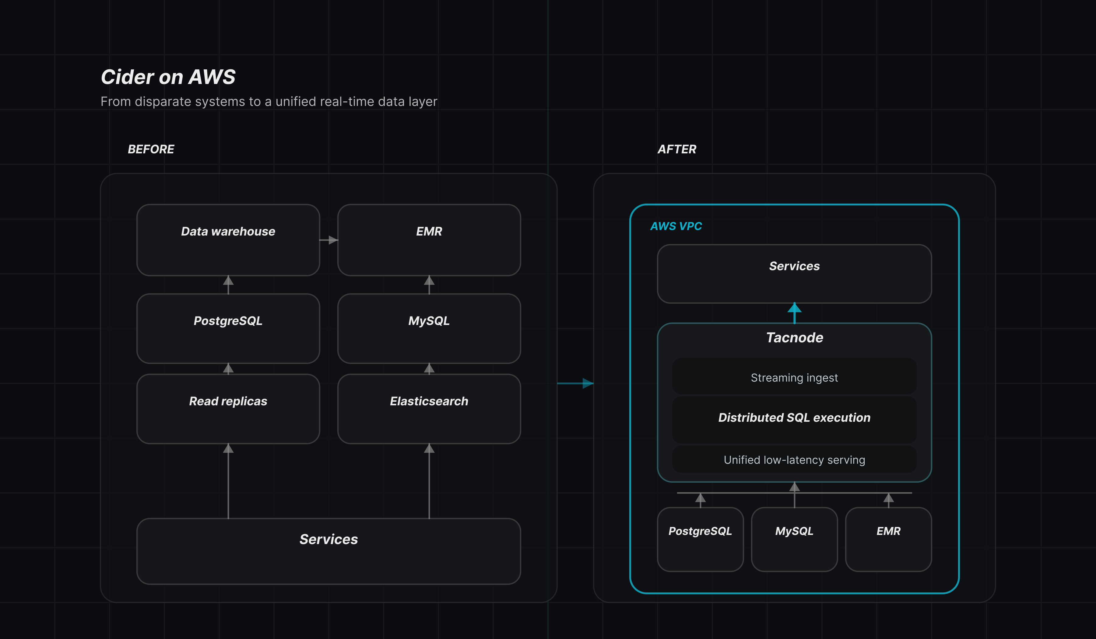 To overcome these obstacles, Cider adopted Tacnode on AWS, enabling a unified, real-time data architecture that delivers low-latency querying, seamless streaming ingestion, and elastic scalability.