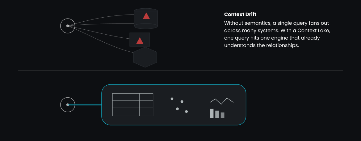 In a Context Lake, the semantics derive from the fact that context is consistent at any moment in time. A query that joins embeddings, transactional history, and live event streams works because the engine guarantees alignment across these signals.