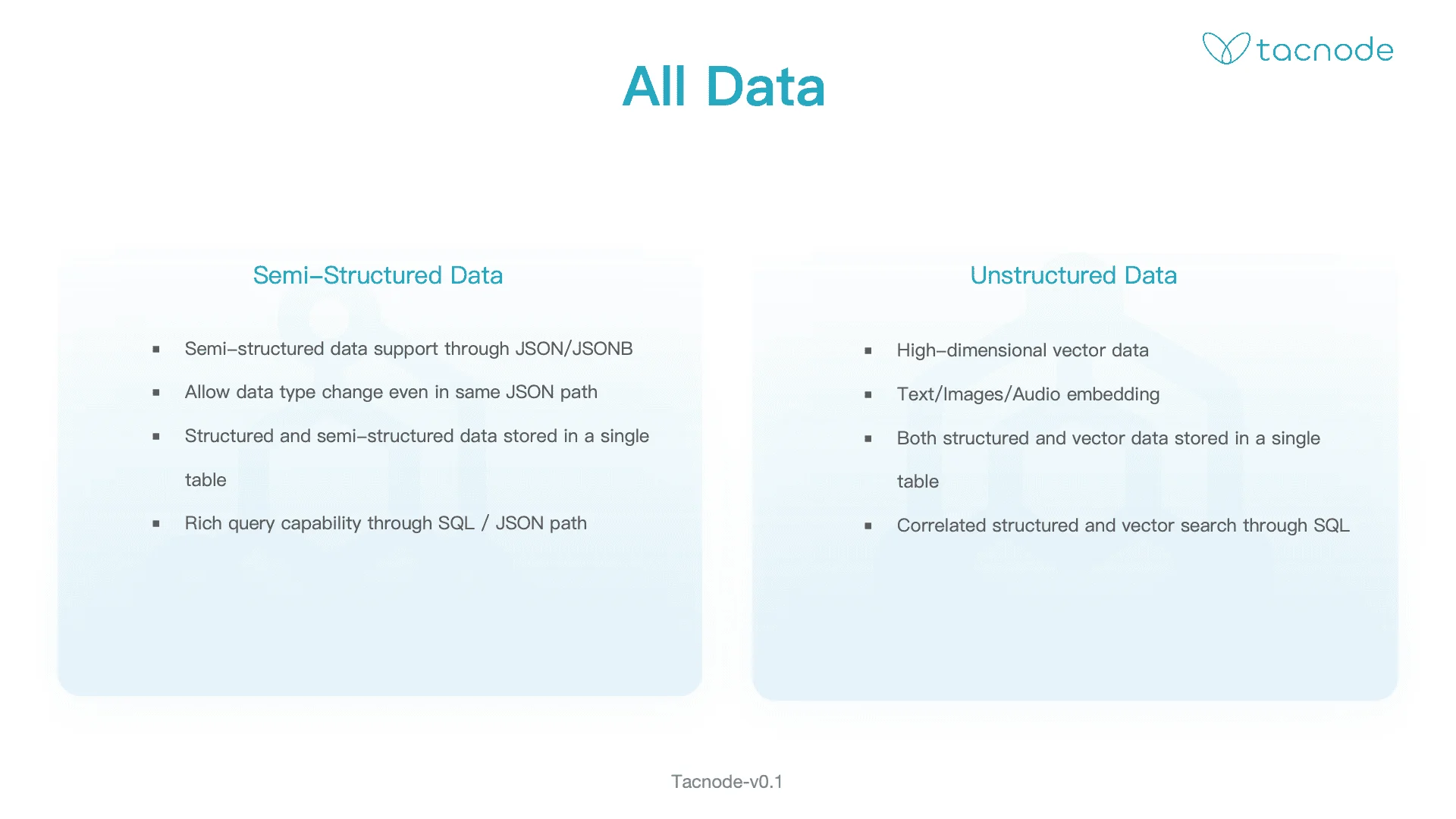 Tacnode has added support for high-dimensional vectors to better handle unstructured data and introduced the Vector data type. Users can store embedded vectors of images, text, audio, and video in the database. They can also store structured, semi-structured, and vector data in the same table and use SQL to perform various complex queries.