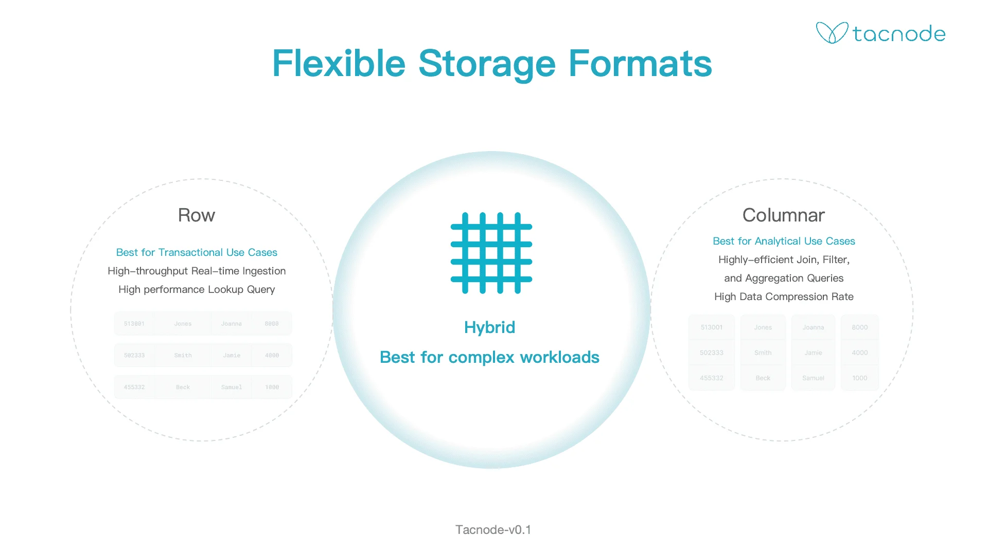 Tacnode supports both row and column storage, enabling users with transactional and analytical needs to utilize hybrid storage. This method combines the benefits of both types, excelling in HTAP (Hybrid Transactional/Analytical Processing) situations. The optimizer evaluates the query to select the most efficient access method.