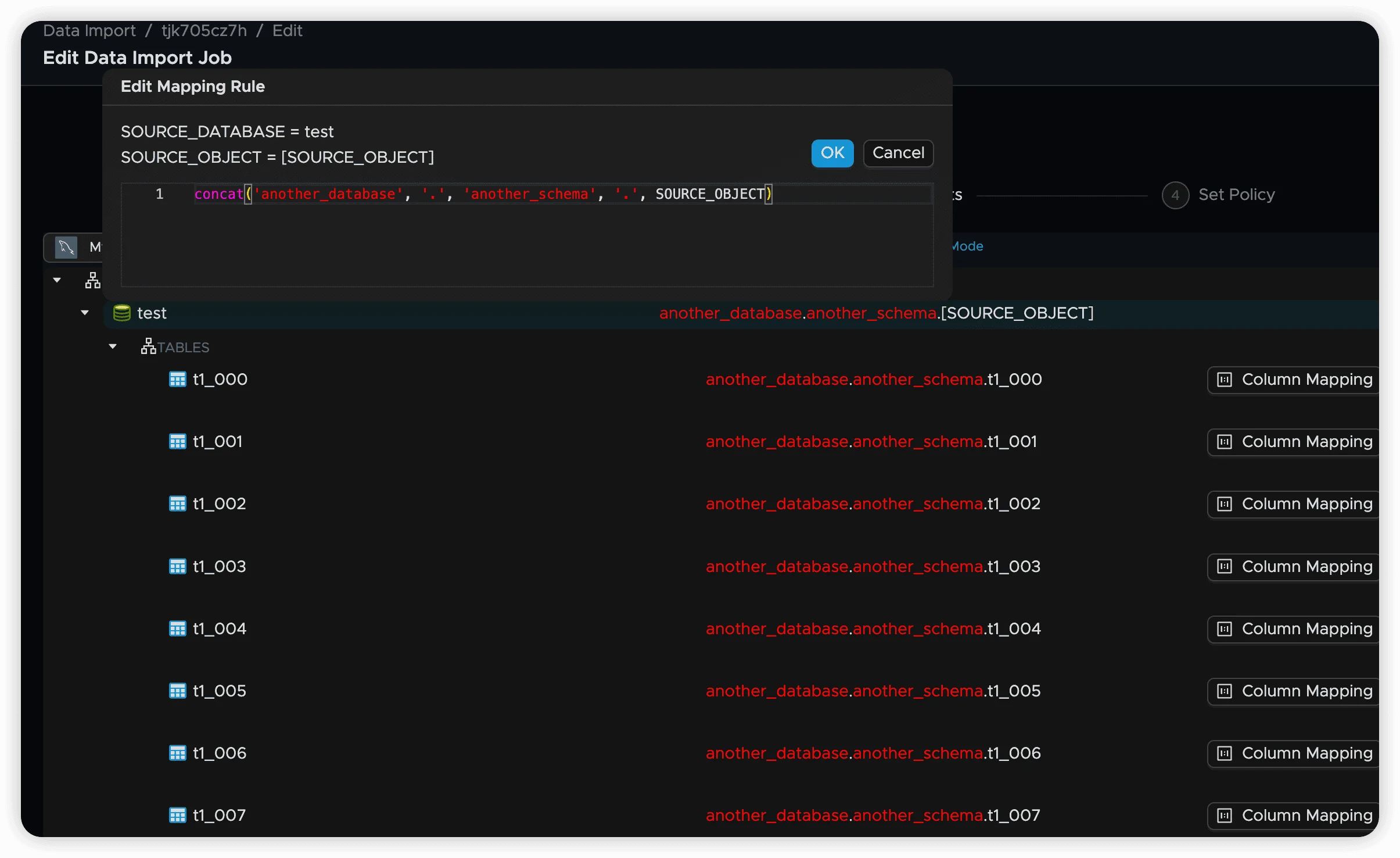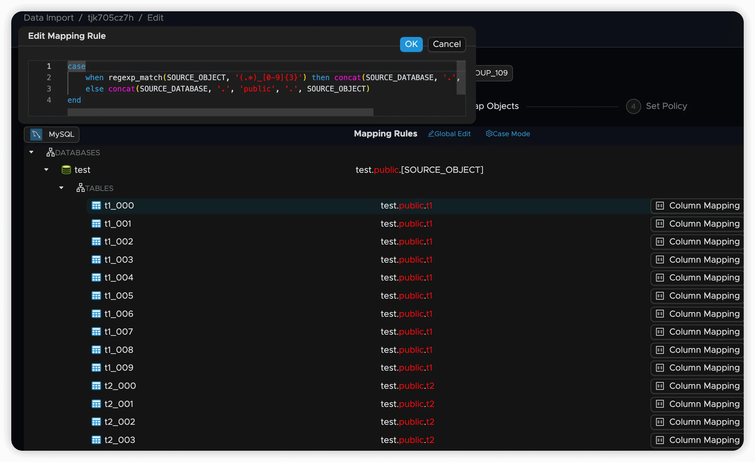 when regexp_match(SOURCE_OBJECT, '(.*)_[0-9]{3}$') then concat(SOURCE_DATABASE, '.public.', $1)