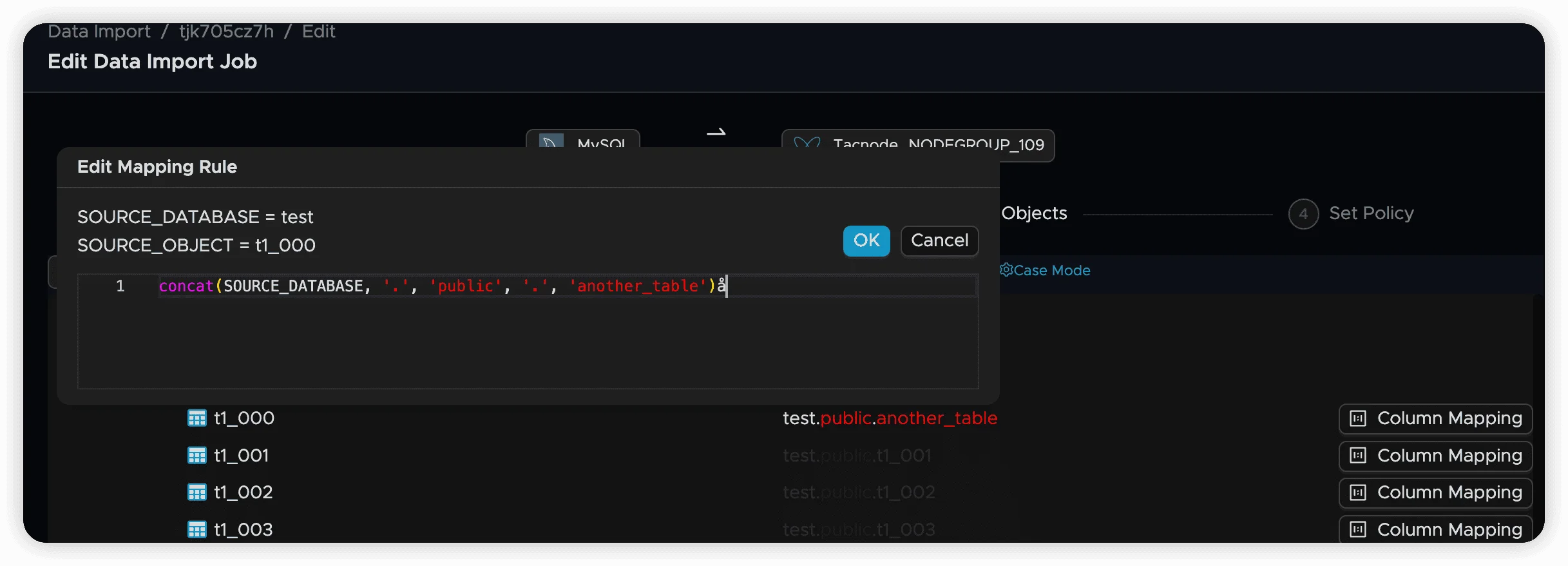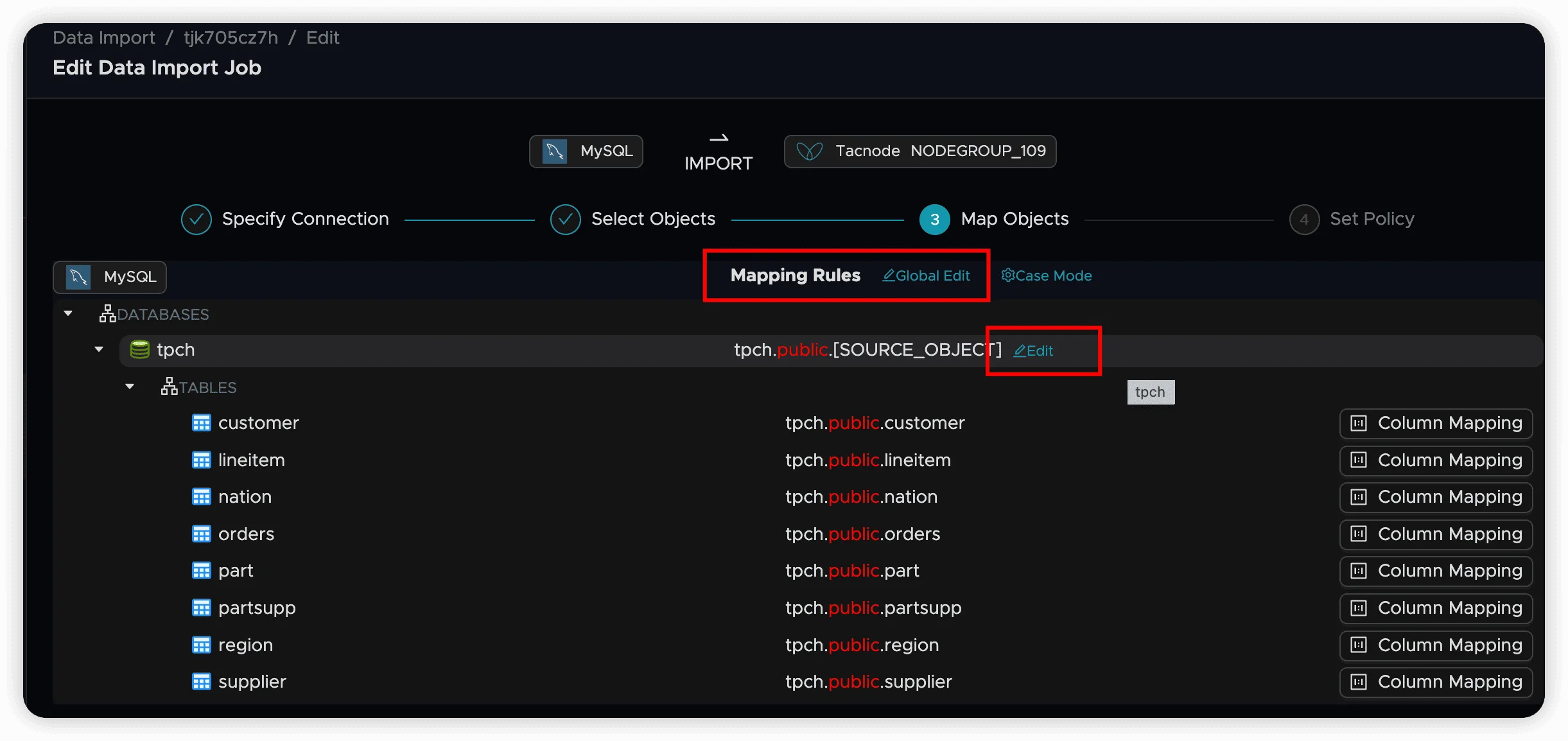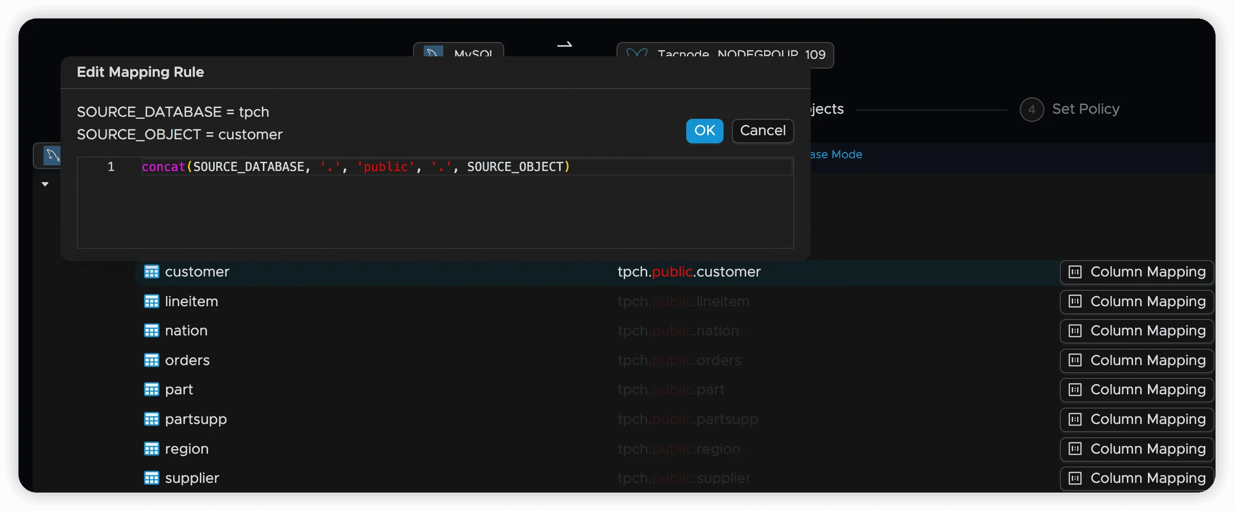 Object mapping defines how source objects (databases, schemas, tables) correspond to target objects in Tacnode. Each synchronization job has default mapping rules that can be customized to meet specific requirements.