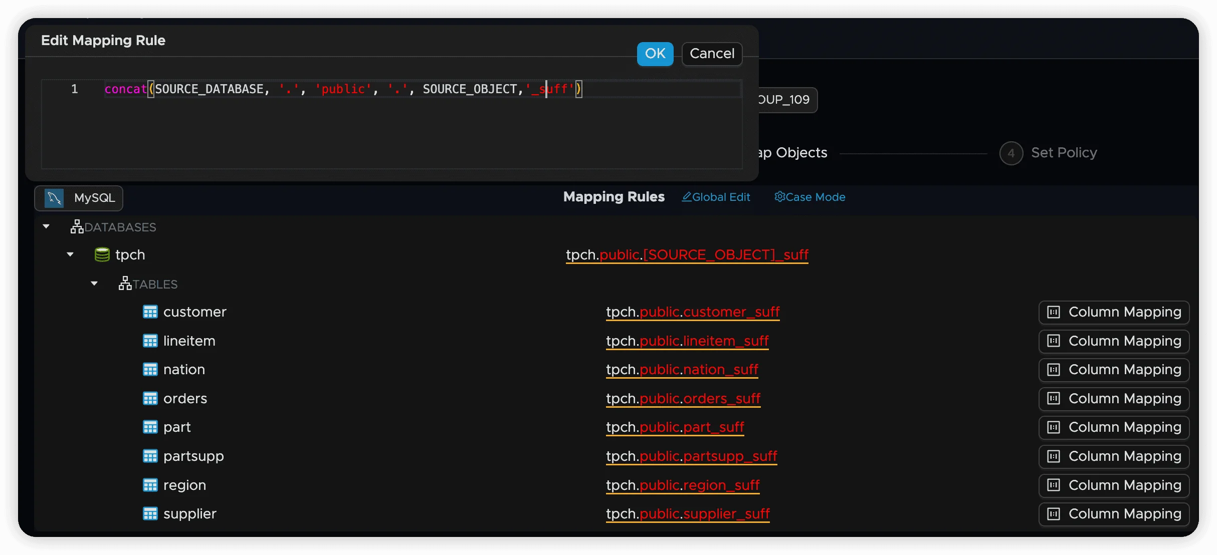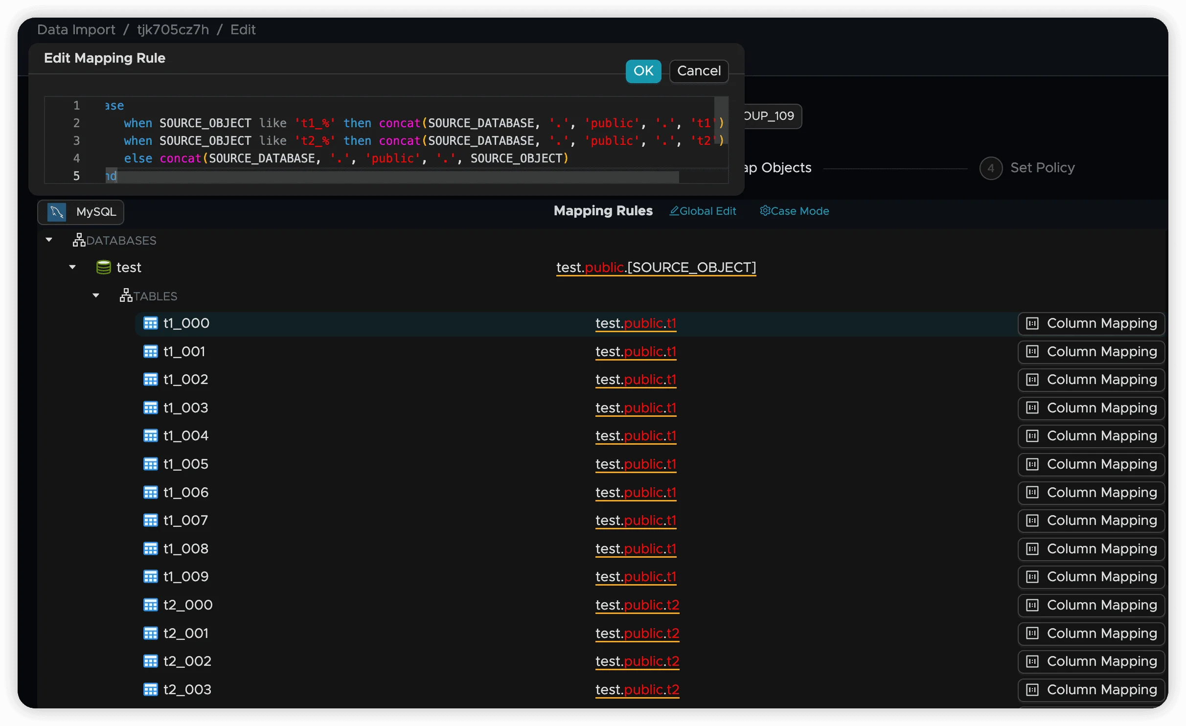 when SOURCE_OBJECT like 'users_%' then concat(SOURCE_DATABASE, '.public.users')