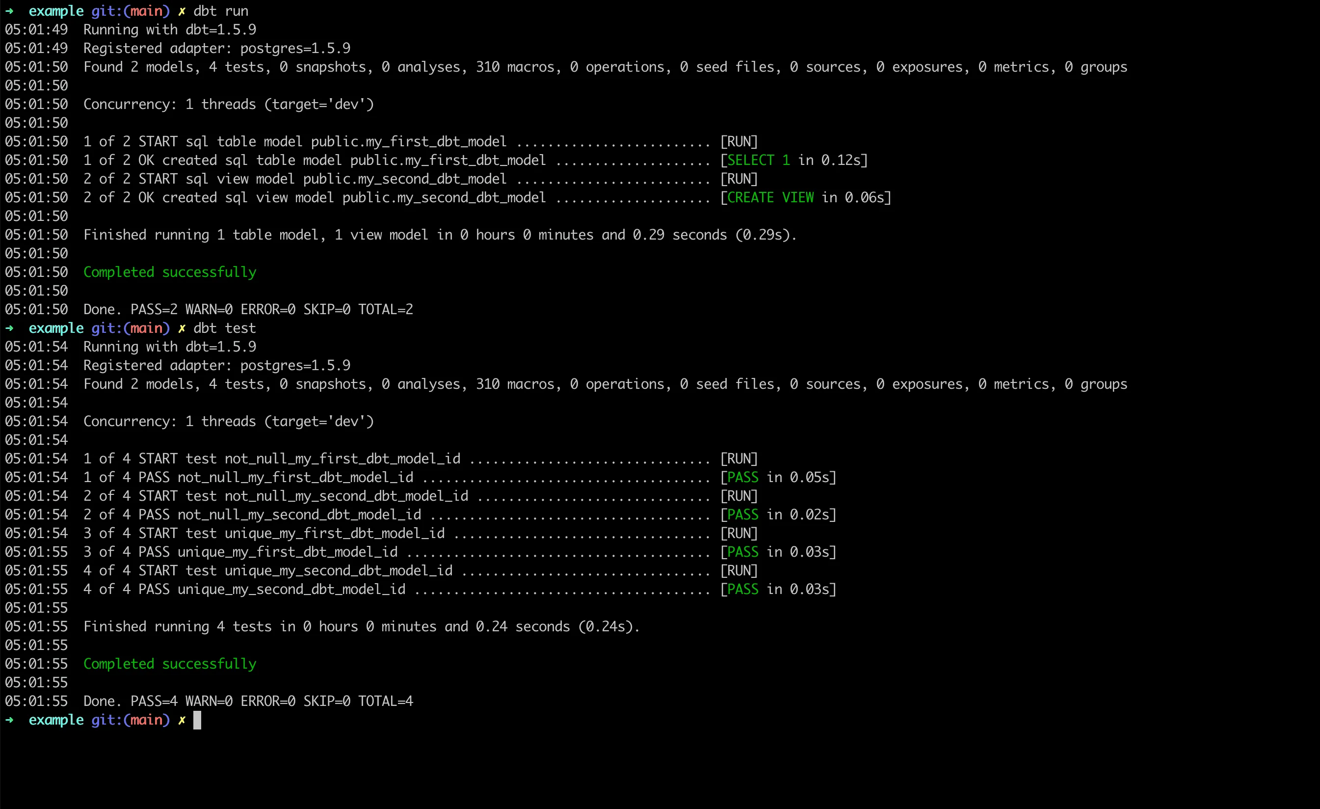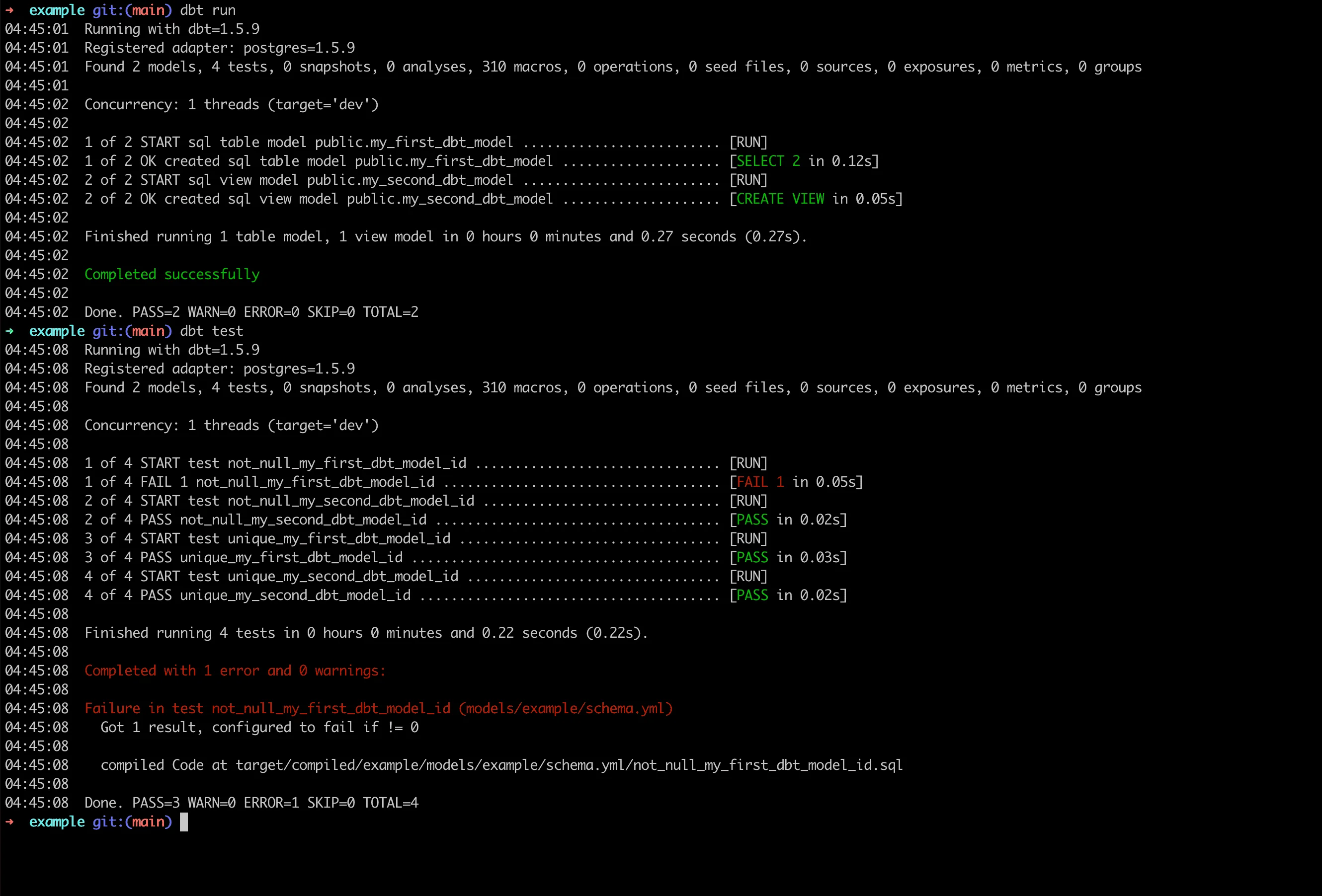 If you encounter test failures like not_null_my_first_dbt_model_id, check the model definition. The issue is typically in models/example/my_first_dbt_model.sql where line 16 generates a NULL value.