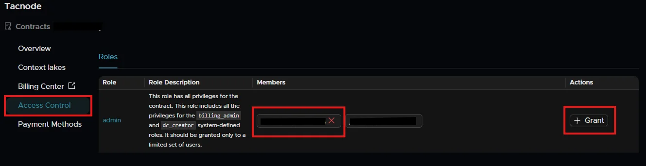 Roles define specific permissions for resource objects. For example, an admin role for contract dc00000001 includes: