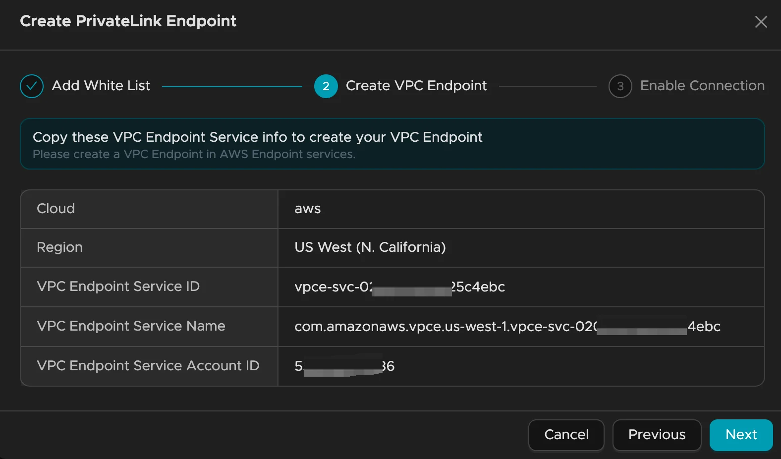 Before creating the VPC endpoint, add your AWS account to the Nodegroup’s endpoint service allowlist.