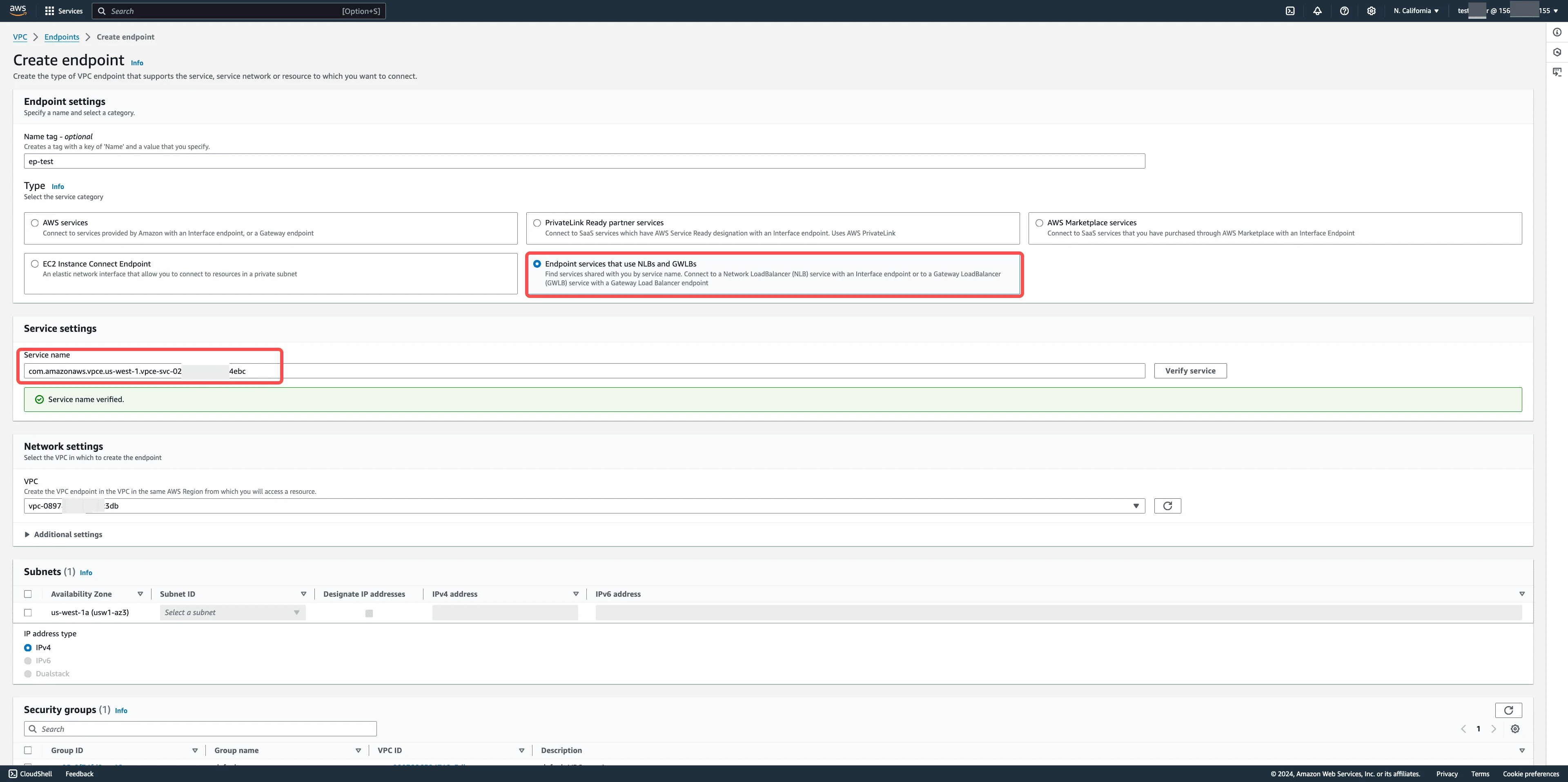 | Subnet Configuration | Availability Zone and subnet | 1. Select Availability Zone matching the endpoint service; 2. Choose appropriate subnet within that AZ |