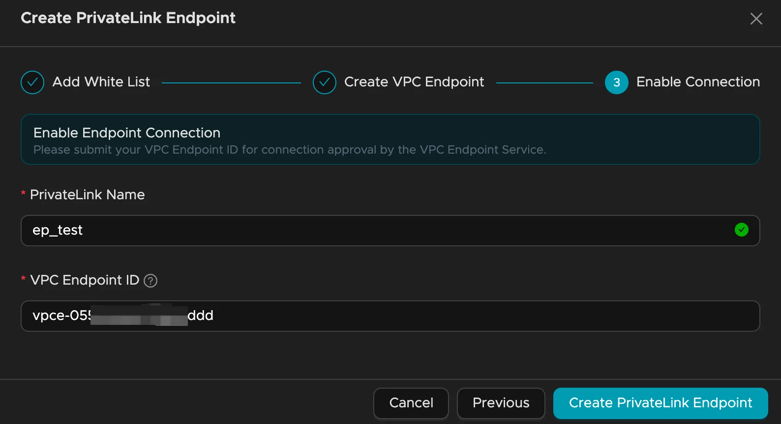 | Service Configuration | Endpoint service setup | Method 1: Click “Find service by name” and enter endpoint service name; Method 2: Click “Verify Service” to confirm service availability. Note: Service discovery requires successful allowlist configuration |