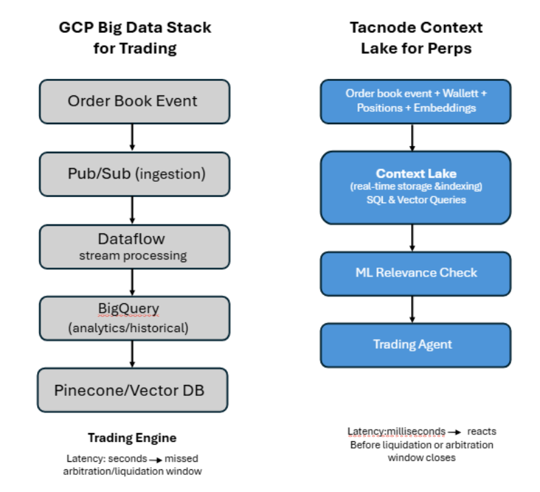 In perps, every millisecond counts. By the time your Pub/Sub job buffers, your arb edge is gone. By the time BigQuery aggregates, the liquidation cascade has already rippled through the book.