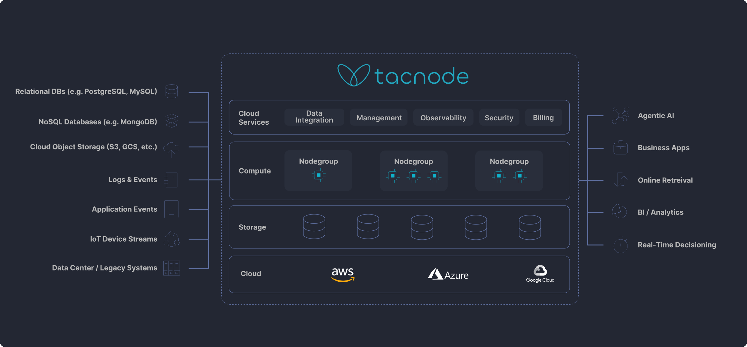 Unlike warehouses or lake houses, Tacnode doesn’t just store data for later use — it makes it instantly query able and keeps it ready to serve.